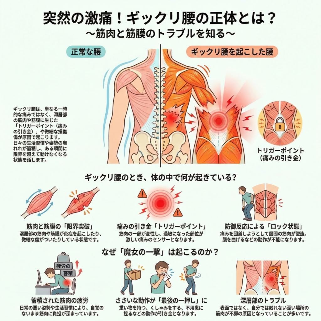 ギックリ腰は、ある日突然起こるように見えますが、実は日常的な負担の積み重ねが「限界」を超えた瞬間に発生します。
