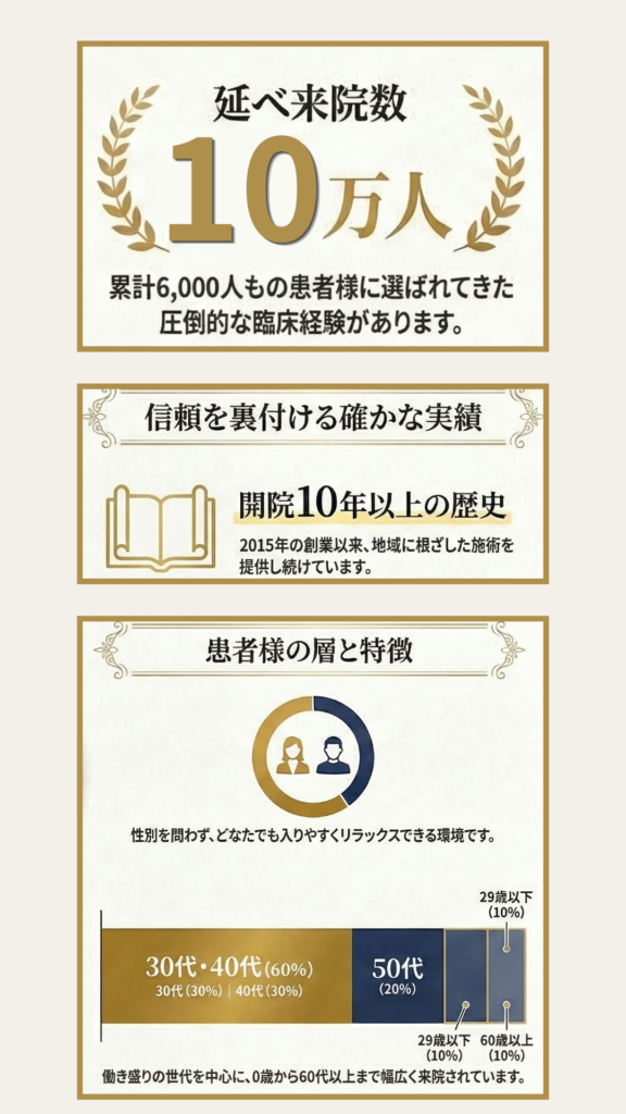 当院は難波の地で開業10年以上、延べ10万人の施術実績を積み重ねてきました。20年以上のキャリアを持つ施術者が、解剖学的な分析に基づき痛みの「引き金」を特定。トリガーポイント療法や最新の治療機器を駆使し、お一人おひとりに最適な「根本改善」を提案します。