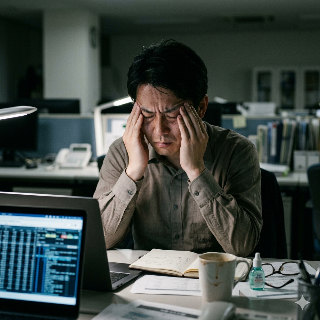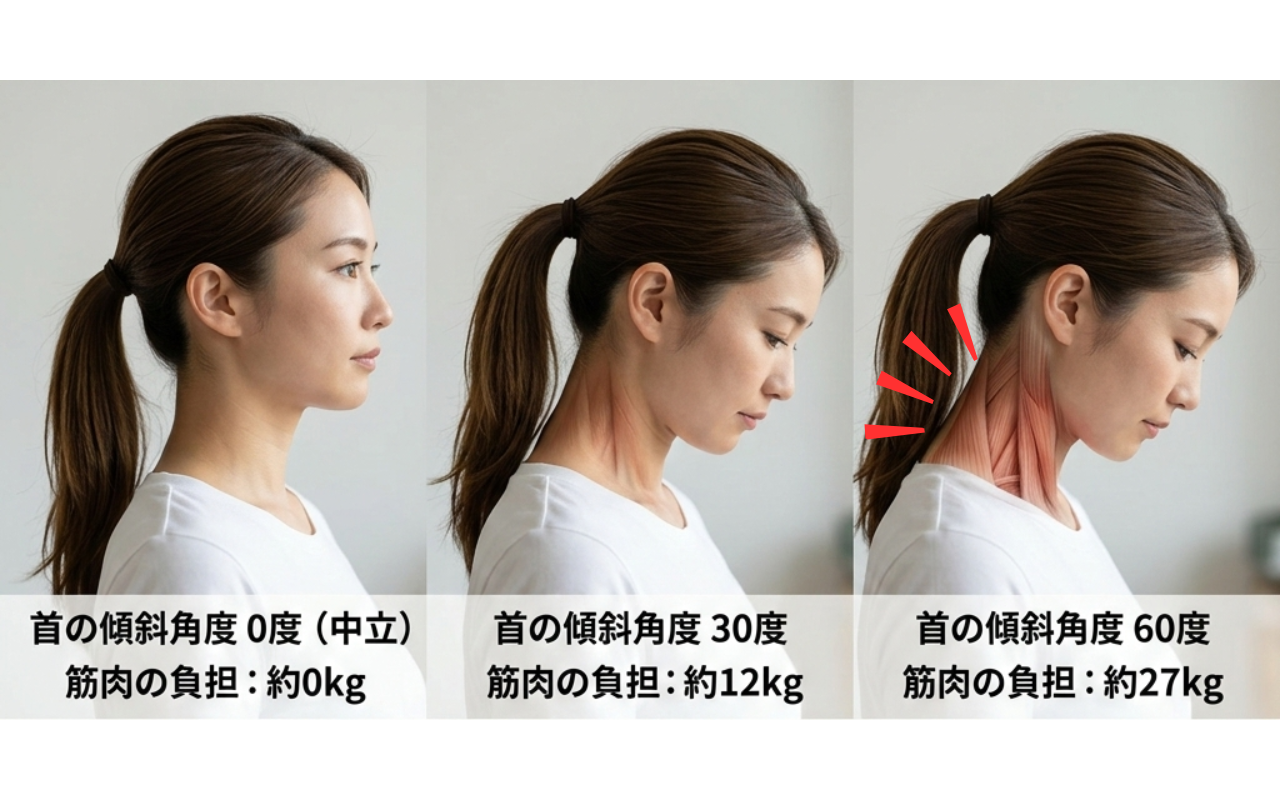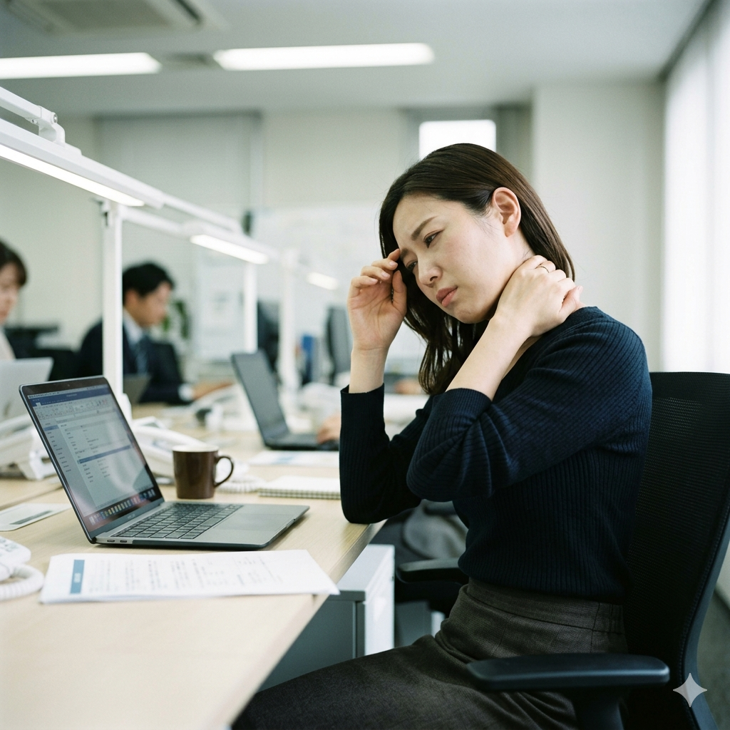 長時間同じ姿勢で画面を注視すると、首の「しなり」による分散ができず、特定の関節に負荷が集中。夕方になるほど筋疲労がピークに達し、重だるさが強まります。