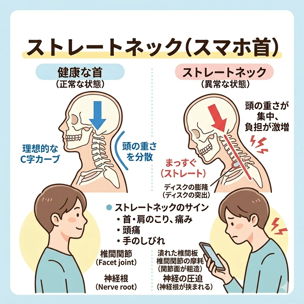 単なる「肩こり」の延長ではなく、首の骨の変形や椎間板の摩耗、さらには自律神経の乱れによる「原因不明の不調」を引き起こす、全身疾患の入り口とも言える状態です。