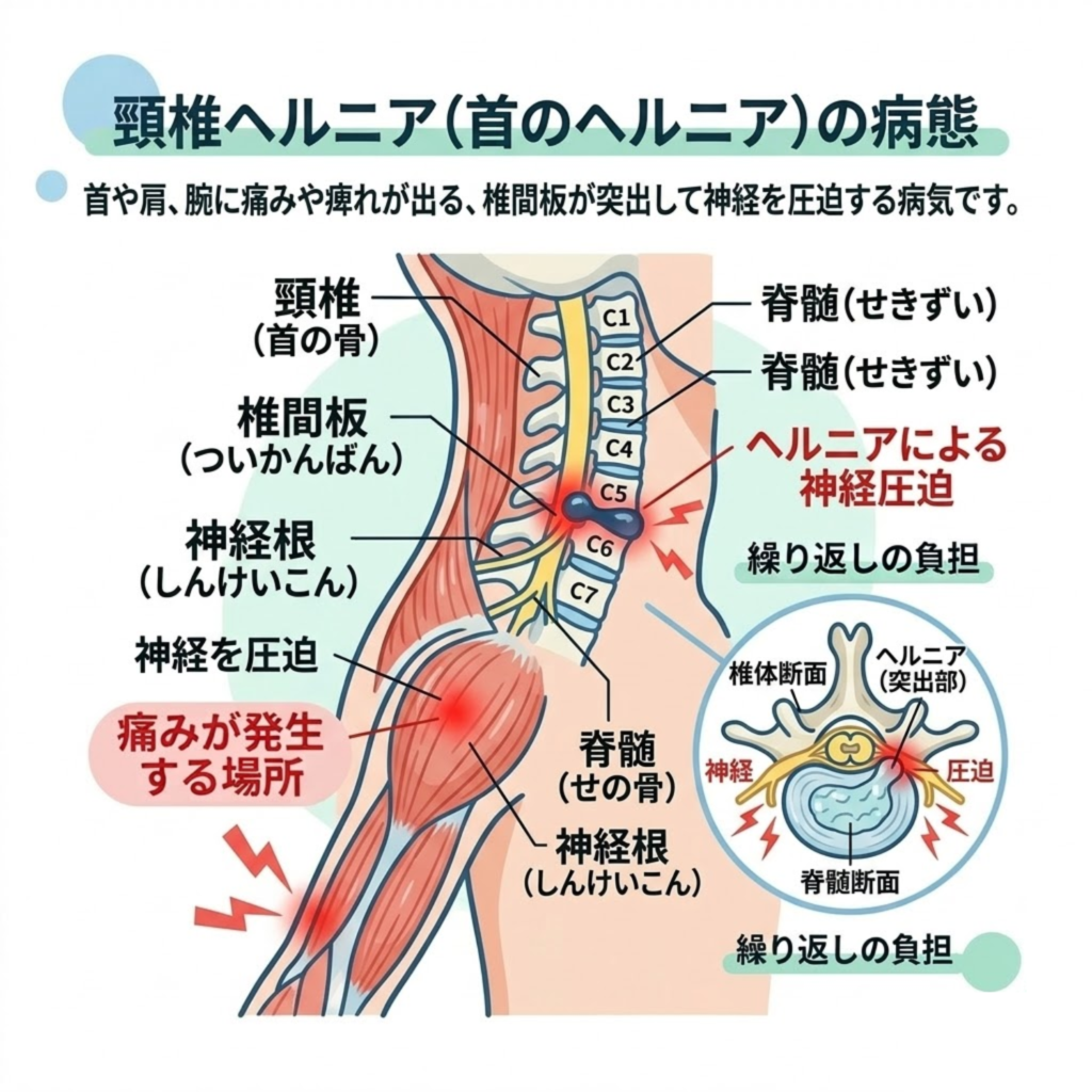 飛び出した髄核が、すぐそばを通る**「神経根」や「脊髄(せきずい)」**を物理的に圧迫します。これにより、首だけでなく肩や腕、手先にかけての「鋭い痛み」や「しびれ」が出現します。