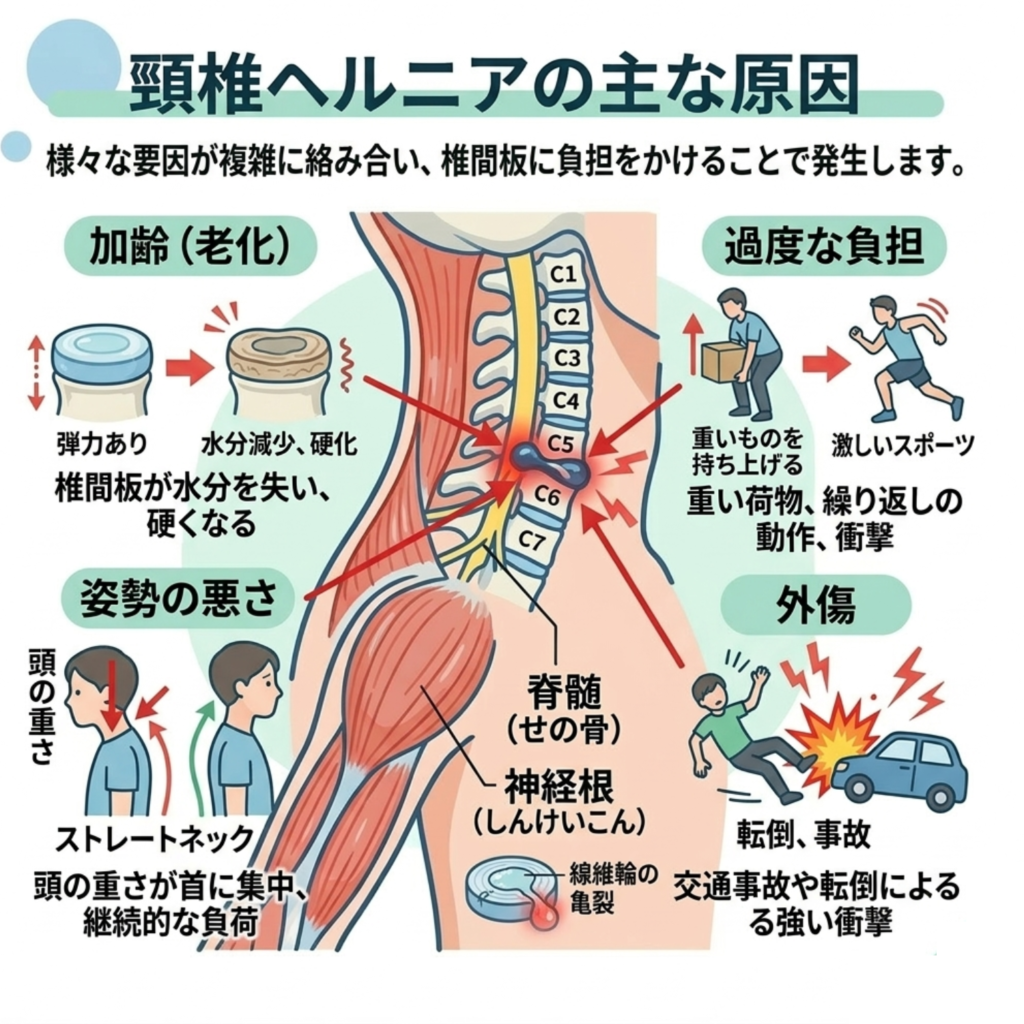 交通事故による**「むち打ち」**や、コンタクトスポーツでの激しい衝突など、一瞬にして頸椎に大きな力が加わることで椎間板が損傷し、発症するケースがあります。